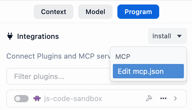 LM Studioの Programタブ(ツールアイコンをクリックすると右端に表示)で Install をクリックし、Edit mcp.json を実行します。