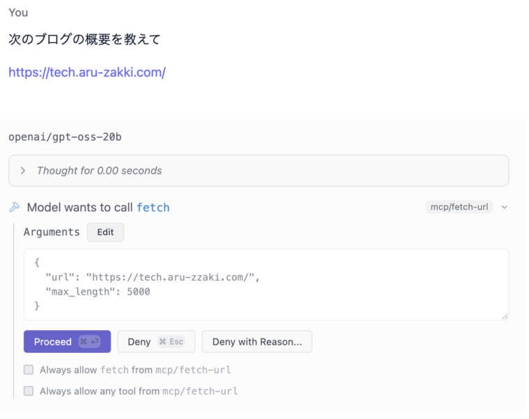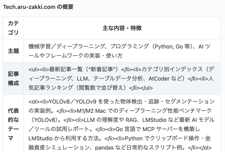 動作確認を兼ねて、このサイト(https://tech.aru-zakki.com)の概要をまとめてもらいます。利用したモデルはgpt-oss-20b