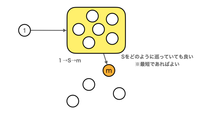 ここで、セールスマンが0→….→mというように、都市mにいるとします。これまで通過した都市の集合をSとすると、集合Sにどの都市が入っているかだけわかれば、まだ訪問していない都市はわかります。また、実は、都市の集合Sを訪問して最後に都市mに到着した時の最短のコストだけ記録していればよく、道のりを知っている必要はありません。つまり、訪問した都市と訪問していない都市の区別がつけば良いことになります。