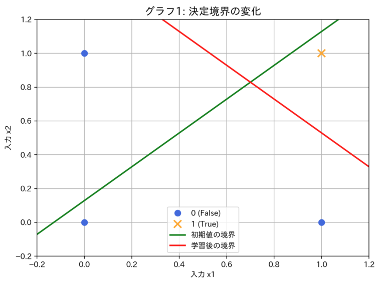o)が「偽(0)」、オレンジのバツ(x)が「真(1)」のデータ点です。 - 緑の線: 学習開始時のパラメータが作る初期の境界線です。この時点では、データを全く正しく分離できていません。