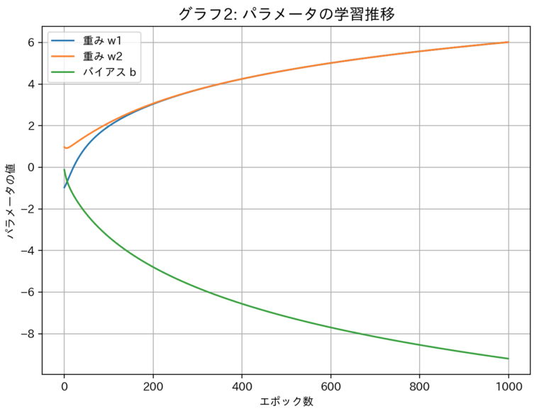 次に、境界線を動かしていたパラメータ(w1,w2,b)自身の変化を見てみましょう。