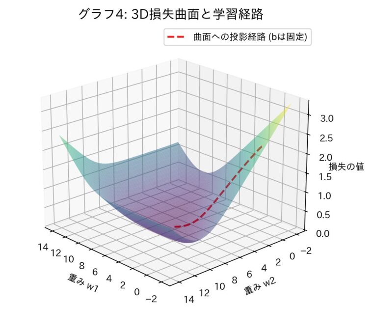 グラフ3を3Dで表示したものです。パラメータの学習経路(赤い点線)が、お椀のような形をした曲面の斜面を下っていく様子がより立体的に捉えられます。逆伝播とは、この「損失の地形」における現在地の傾き(勾配)を計算し、パラメータを谷底の方向へ一歩進める、という処理を繰り返しているのです。