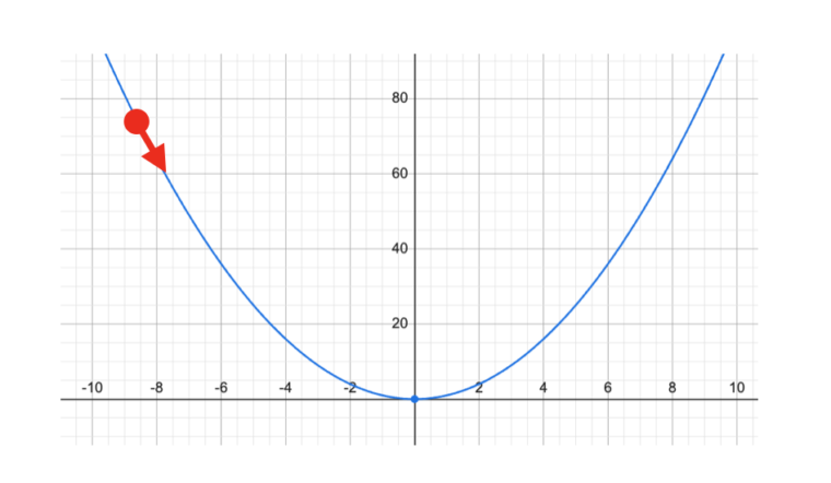 勾配降下法では、まず放物線上のランダムな点(たとえば図の赤点)からスタートします。そして、その点の「傾き(勾配)」を計算します。もし傾きがマイナスなら、谷は右側にあるのでxを少し大きくします。もし傾きがプラスなら、谷は左側にあるのでxを少し小さくします。この「傾きを見て、谷の方向へ少し下りる」というステップを繰り返すことで、最終的に放物線の底にたどり着くことができます。